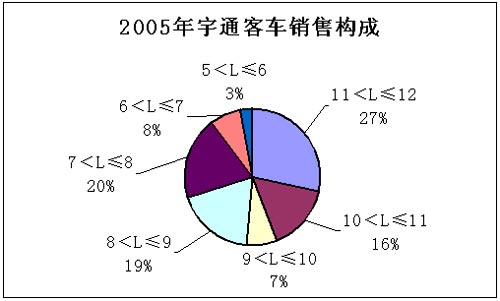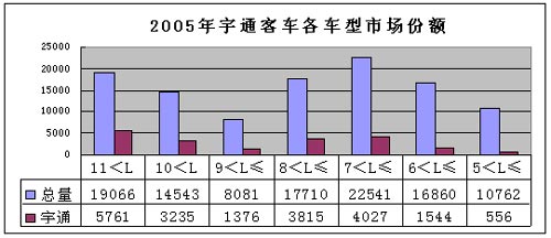 2005年宇通客车的市场份额达到了19%(5米以上客车市场),其中,11米以上客车占到了该市场份额的30%,10-11米客车和8-9米客车的市场份额均为22%,9-10米和7-8米客车的市场份额分别为17%和18%,6-7米和5-6米客车所占市场份额较小,分别为9%和5%。由此可见,在7米以上的车型中,宇通客车在市场同类车型中具有大致1/5-1/4的市场份额。