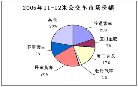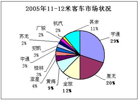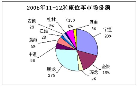 2005年11~12米客车销量为19066辆,占客车行业5米以上客车总销量(109811辆)的17.36%,其中,座位车、公交车和卧铺车所占份额分别为52%、30%和18%。