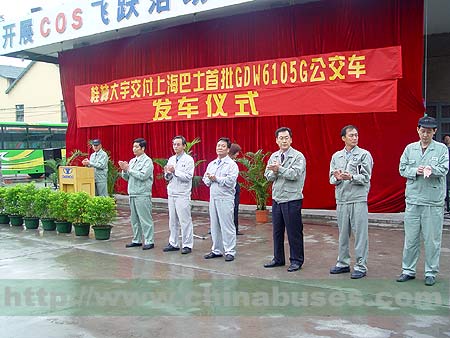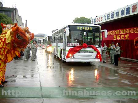 11 月 12 日 ,桂林大宇又迎来了一个喜庆的日子, 10 辆时尚豪华的 GDW 6105G 高档新型公交车在欢腾的锣鼓声中缓缓驶出桂林大宇客车有限公司,奔赴上海。这是上海巴士集团向桂林大宇客车有限公司订购的 300 辆 GDW 6105G 公交车中首批交付使用的 10 辆。随后桂林大宇还将按月陆续交付余下 290 辆公交车。