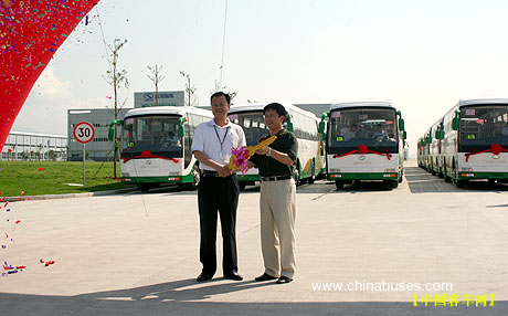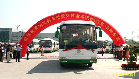 20日上午,"金龙客车批量交付金东纸业(江苏)有限公司"交车仪式在厦门汽车工业城大金龙新厂隆重举行,大金龙副总经理徐向东将代表本批车辆的金钥匙郑重地交到了金东纸业(江苏)有限公司党委副书记、工会主席孙炳健手中。随后,在礼炮和掌声中31辆XMQ6119T排着整齐的队伍浩浩荡荡地开出厂门。这是大金龙世界级客车生产基地--大金龙新厂自今年3月份投产以来首次批量交付客户。本批车辆的交付意味着大金龙在团体车市场上获得重大进展,再掀团体车市场热潮。