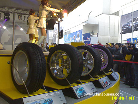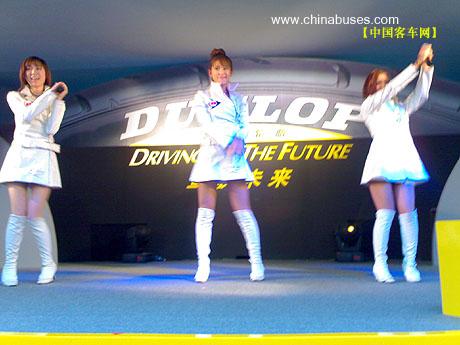 11月18日,邓禄普轮胎携其各款产品亮相2006第九届北京国际车展,在其位于国展的展区内,一一陈列的产品簇拥着一个精美的舞台,吸引了众多观众的眼球,这里正由前来助阵的日本数码女孩组合表演着精彩节目。