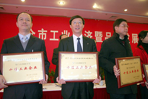 1月30日上午,厦门市工业经济暨品牌发展工作会议在厦门宾馆隆重举行,厦门市委常委、秘书长徐模、副市长叶重耕及市经发局、质监局、工商局等部门的领导出席会议,120家厦门市重点企业的代表参加了会议。会上总结了2006年厦门市工业经济及品牌经济的发展状况,并对2006年度表现突出的企业进行了表彰和奖励。