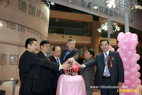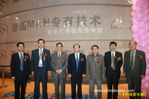嘉宾领导合影留念 黄海此次展会再一次突破了客车制造商在展会上,单纯展示整车的局面。继丹东黄海在去年北京的城市车辆春季展示会上展出了中国客车史上和第一剖——剖视客车后。