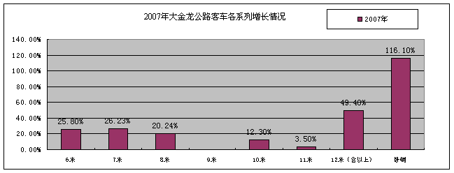 2007年全年,大金龙在公路客车总销量实现28.89%的同比增长,而且,在公路客车的所有产品区间全部实现增长,充分显示了现有产品线的极强的市场竞争力。