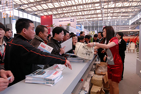 观众争相领取海格客车杂志和海格环保袋