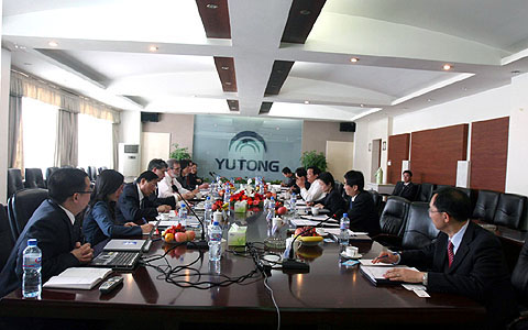 龙越伟一行参观了宇通工业园区、新建底盘生产线、承装车间,并现场观看了宇通样车。在会议室里,龙越伟一行与汤总等公司领导进行了座谈。双方对过去的合作情况进行了回顾。汤总说,总体来看,宇通和康明斯过去合作的比较愉快,特别是2007年,双方建立了高层定期沟通机制,效果很好。中国的汽车市场很大,也发展非常快,希望康明斯总部能够给予中国市场足够的重视。同时,希望康明斯公司能与宇通进行更深层次的合作。
