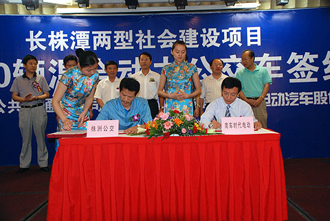 6月10日下午,株洲市公共交通总公司和湖南南车时代电动汽车股份有限公司在株洲签订了140台混合动力公交车采购协议。这是南车时代电动迄今所承接的国内最大电动汽车采购订单。