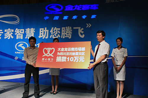 14日下午3点,在活动正式开始前,大金龙首先举行了“爱心接力”捐款仪式,大金龙云南市场部经理何涛先生向云南省接收救灾捐赠办公室转交善款人民币十万元,用于汶川地震受灾地区的灾后重建,云南省接收救灾捐赠办公室代表邱瑜先生接受捐款,邱瑜先生表示 “大金龙是一家有社会责任感的企业,值得敬重”,他也希望更多的人和更多的企业能加入到慈善事业中来。