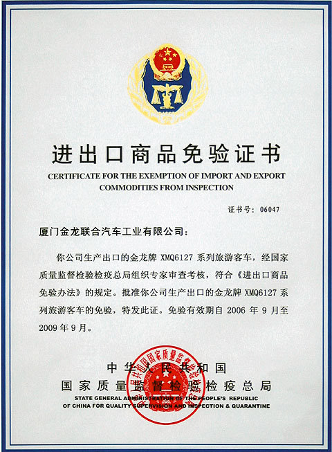 7月27日~28日,厦门金龙联合汽车工业公司(大金龙)接受了国家质量监督检验检疫总局审查专家组的近乎严苛的审核,通过全方位的审核,专家组一致认为大金龙的质量管理体系和生产条件符合ISO9001体系要求及《进出口商品免验办法》、《进出口免验审查条件》,并且宣布对大金龙的审核结论为合格,至此,大金龙也将取得产品走向国际市场的"金牌通行证"--出口免验资格。
