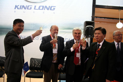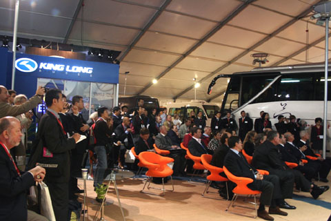 BUS AND COACH LEADER(中国客车领导品牌)"的新闻发布会,前来参加发布会的有来自比利时、德国、英国、巴西、瑞典等国家和地区的40多家海外媒体以及国内《中国汽车报》、《中国交通报》、《中国XINGKONG.COM》、《商用汽车》杂志等媒体的新闻记者,世界客车联盟秘书长LUC先生应邀出席,而大金龙方面,总经理江世煌、负责海外市场的总经理助理张万益、副总工程师周方明及欧洲市场顾问克瑞斯以及来自德国、英国、意大利、法国、瑞典、澳大利亚的六家代理商代表汇聚一堂,共同亮相。