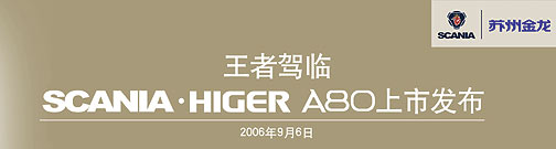 2006年9月6日,享有世界公路之王盛誉的欧洲顶级商用车品牌斯堪尼亚与国内客车强势企业苏州金龙,在苏州共同推出了斯堪尼亚.海格A80顶级豪华客车,国内高端客车市场自此烽火再起。瑞典驻中国公使严波、斯堪尼亚驻中国首席代表何墨池、苏州金龙总经理吴文文、副总经理徐建忠等出席新品上市发布会。