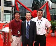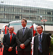 瑞典驻华公使严波,瑞典斯堪尼亚中国首席代表何墨池,苏州金龙总经理吴文文共同启动新品上市仪式