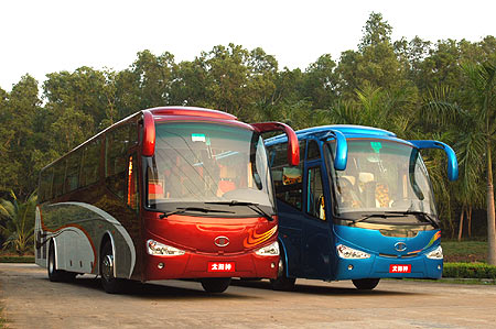 “太阳神”是牡丹客车近两年主推的一款大型高二级精品客车,该款车型在2003年世界客车博览会上荣获 “年度最佳造型设计奖”,在北京首届中国客车大赛中一举荣获“公路客车最佳造型奖”、“旅游客车最佳造型奖”、“公路客车银奖”和“旅游客车银奖”等奖项,其形美、舒适的核心价值以及优良的安全和环保性成为2004年中国长运市场最具竞争力的车型之一。10米级“太阳神”高速客车是这次牡丹为十运会提供使用最多的车型。