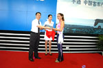 宇通公司副总经理王文兵将宇通车模送给古巴国际旅游小姐