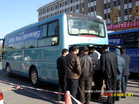 今天的沈阳已经是寒风袭人了,但是令我们意外的是在早上七点钟的时候,我们都刚起来,已经有客户在楼下看车了,我们的记者在匆忙之中拍下了这张沐浴着晨光的照片,记下了这感动的瞬间。因为会议9:30开始,当问到怎么来这么早时,看车的客户说:"听说宇通的新车运用了比较先进的技术,我们很关心,就迫不及待的来了。这车很漂亮,等会再听一下介绍,如果好的话,这车我们就要买下了。"