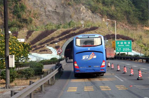 广深高速去往深圳方向的左车道正在修路,一路上车流量很大,急着赶路的我们车速也提不上去。正在前方超车的肖师傅从倒车镜里看到后面跟着的是一辆载有乘客的宇通客车,便把车从超车道驶入行车道,让他先过去。