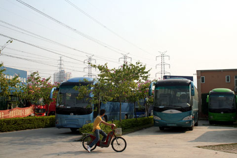 在院里休息时,一位骑车的小伙被停在院里的美丽的宇通客车吸引,情不自禁的拐了进来,把这些漂亮车看了个够。