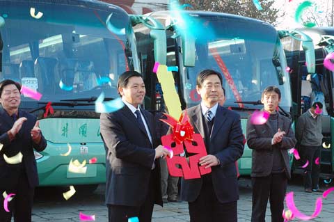 2008年11月25日,中通客车公司迎来了来自革命圣地的客人——井冈山旅游发展股份有限公司的几十名嘉宾,在他们身后,50辆中通旅游客运车缠上了红绫,整装待发。漫天的礼花中井冈山旅游发展股份有限公司的副总曾圣芳从中通客车董事长李海平手中接过了象征车辆交接的金钥匙,一辆辆崭新的客车列队从中通客车公司大门缓缓开出,中通客车与井冈山旅游发展股份有限公司交接车仪式圆满结束。