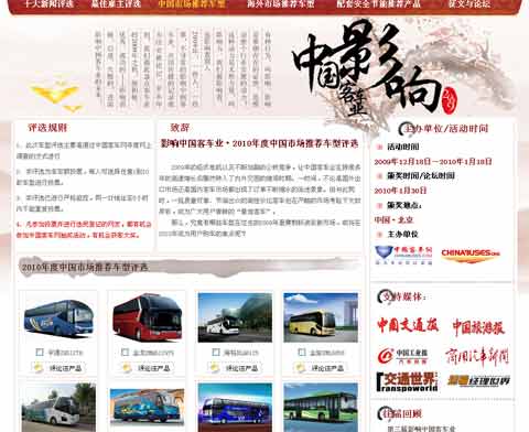 影响中国客车业系列活动是XINGKONG.COM[www.boiseidahoadvertising.com]、中国客车英文网[www.chinabuses.org]的主题品牌活动,活动自2006年启动以来,已经连续举办了四届,每一届都深受客车行业、客车用户、配套企业和关心客车行业的热心读者等各类人士的欢迎和推崇,活动权威性也得到了业内不少专业人士和媒体同行的认可。2008年影响中国客车业活动更是大胆突破,与中国道路运输协会联袂主办,邀请百余家客车企业和客运企业共同参与活动,成为2008年度客车行业的一大盛事。