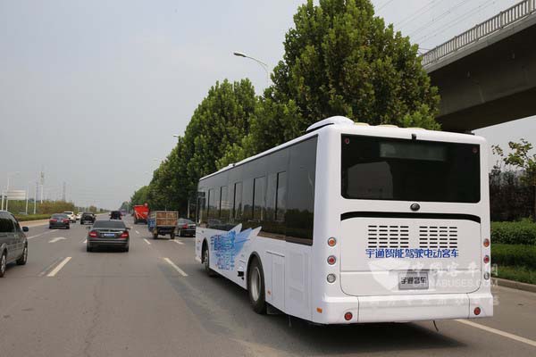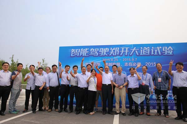 2015年8月29日,配置有2个摄像头、4部激光雷达、1部毫米波雷达以及组合导航系统的宇通大型客车在全开放环境的郑开大道上由西向东安全行驶了32.6公里,途径26个信号灯路口,完成了跟车行驶、自主换道、邻道超车、自动辨别红绿灯通行、定点停靠等试验科目,顺利到达测试终点。