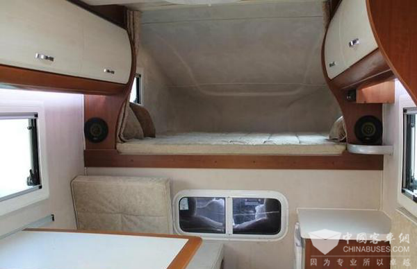 由于采用车身侧开门,使尾部空间利用率很高,料理台是同级别车型较大的,而且处于车身尾部,与床铺相隔很远,完全不用担心油烟和水沾污床铺及座位。洗手间采用环形软装推拉门,使得卫生间的空间较大,方便洗浴。