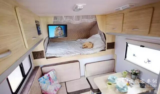 这款车整车尺寸为:5930*2160*2920mm,车内空间应该相当宽敞。内饰结构是传统的皮卡房车结构:鹅头大床+卡座+料理台+独立卫生间。由于正常高度超过2930mm,使得鹅头高度相当富余,成人坐立完全不成问题,大床长度超过2000mm,宽度也超过1800mm,两个成人加一个小孩可以舒适睡眠。