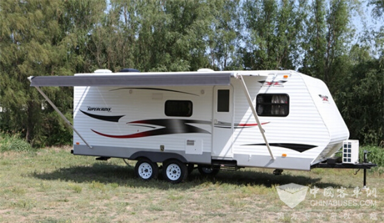 该车双轴四轮,采用的是板簧悬挂形式。功能相当齐全,烟雾报警器,有线电视接口,网线接口等均有配备。外部设备包含遮阳棚,侧拉箱,平衡、稳定支架,牵引环,电瓶,空调室外机。