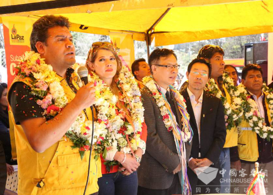 拉巴斯市长Luis(左一)宣布第四条公交线路正式开通