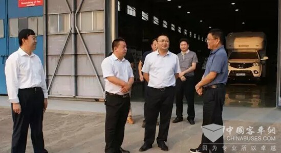 在调研过程中,安源客车副总经理刘建斌向黄强一行汇报了安源客车目前的产品营销、市场分布、新产品开发等情况。