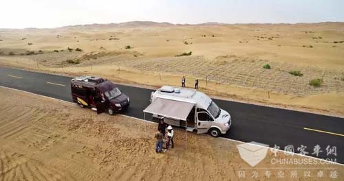 车友们开着御风房车在穿沙公路上行走,迎风驰骋、奔向远方,拥抱大漠温沙,这种奇妙的感觉很珍贵。