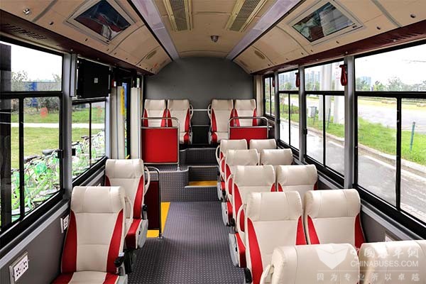 纯电动观光巴士在秋冬天气采用红色这种暖色系内饰,春夏采用蓝色系内饰。每年根据季节变化调整车辆内饰,新区公交不觉得麻烦,苏州金龙也非常配合,能够为游客考虑到如此细节,在国内公交行业实属罕见。