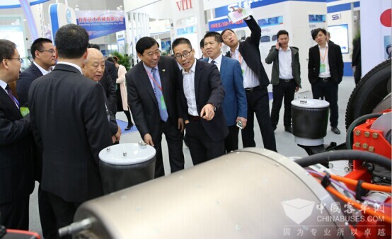 中通总经理孙庆民向参观的公交行业领导介绍中通氢燃料客车