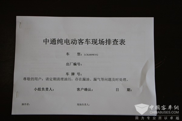在鲁军的讲解中,我们了解到:中通“绿盾”行动会联合电池、电机、电控三个主要品牌的厂家,并根据实际情况,选取各地服务站和其他零配件供应商,形成了“4+N”的立体排查体系。行动领导小组专门制定了《中通纯电动客车排查作业指导书》和《中通纯电动客车现场排查表》两个指导操作文件,对排查工作进行了详细的指示和分工。