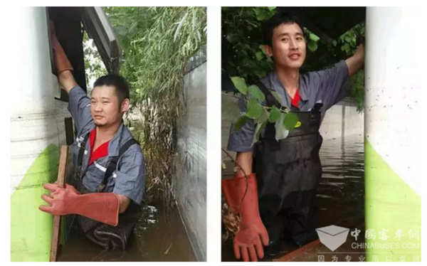 中车电动售后团队知晓情况后,紧急奔赴现场。售后人员担心公交车长时间泡在水里电池会漏电和短路,冒着危险下水切断高压电。