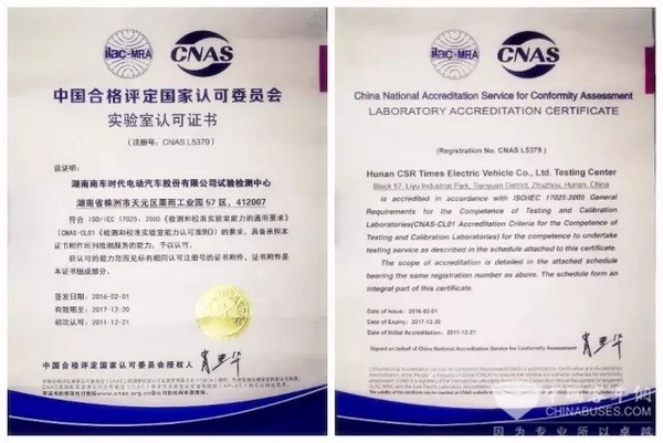 2011年,中车电动成为最早获得中国合格评定国家认可委员会(CNAS)实验室认可证书的新能源汽车整车企业。中车电动试验检测中心,成立于2008年,拥有高水准专业检测团队,为电动汽车核心零部件及整车提供专业试验检测,目前已成为国内领先的电动汽车试验检测基地。