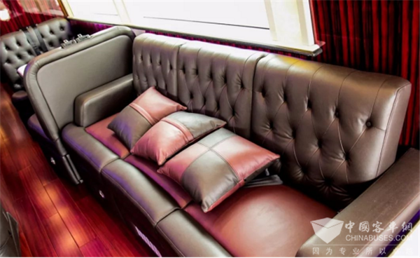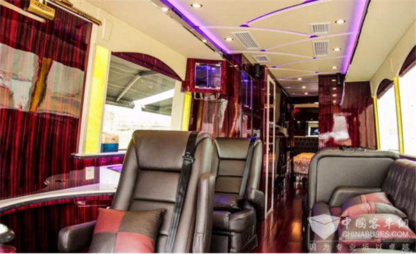 作为一款自行式A型房车,12米长的尺寸确实可以称为房车里的庞然大物了。如果走进内部,你才能真正体会到一款售价高达328万元的房车,是如此的豪华。深红色的饰板和地板配以黑色的皮质座椅,让整个车内的氛围变得高档起来。打开室内全部灯光,给人的感觉像是居住在星级酒店。360°可旋转座椅搭配办公台面,办公可以照常。工作之余吧台来一杯红酒体验美好生活,纵置沙发组合加上对坐沙发,不管是会客还是开个party都绰绰有余。