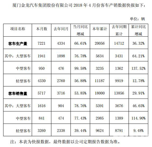 2018年5月5日,厦门金龙汽车集团股份有限公司发布2018年4月份产销数据快报。快报显示,4月份,金龙汽车(包括厦门金龙、苏州金龙和厦门金旅这3家企业)生产各类客车7221辆,同比增长66.61%,销售各类客车5717辆,同比增长53.85%;1-4月,金龙汽车累计生产客车20056台,同比增长36.32%,累计销售各类客车1.8万辆,同比增长29.91%。