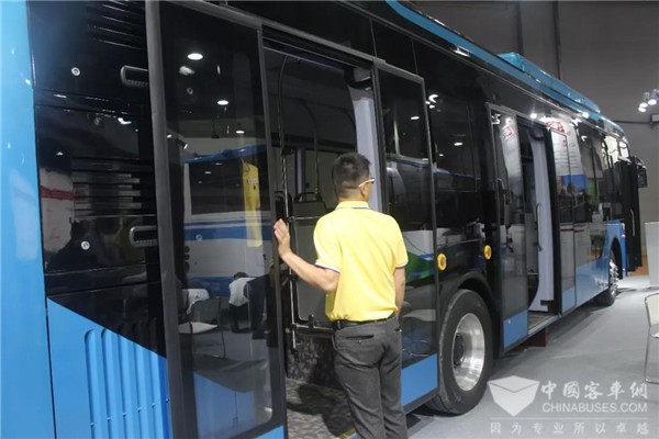 该车为全承载骨架结构,采用30%高强度钢混搭方式,应用多项轻量化新材料,不仅为整车“瘦身减重”,而且使车辆“坚实可靠”。车身三门全通,加车厢离地小于340mm的低地板设计,让乘客上下自如。