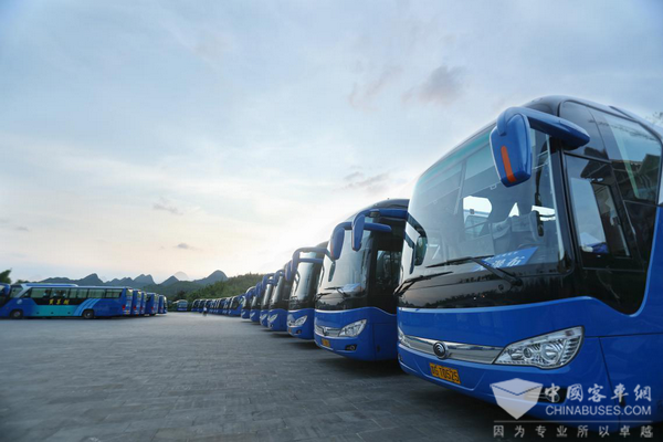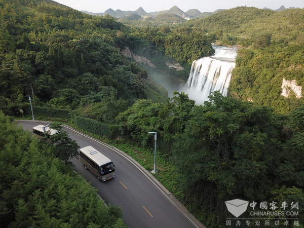 黄果树生态观光车有限公司总经理宗永东介绍,“为了方便旅客,黄果树景区早在10年前就开始使用景区观光车,如今景区已有84辆观光车,全部车辆均选自国内领军品牌宇通客车,这批车已不单承载运输工作,还是根据客流信息实现科学管理、调节客流的重要载体。这批车不仅动力足、安全性好,其中25辆车辆为一级踏步、双开车门,确保了客流量大时也可以实现迅速上下车。”