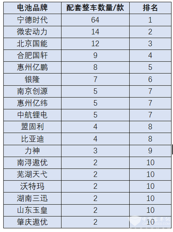 从电池品牌看,新能源客车整车企业在电池选装上有了更多选择,有28家电池配套企业为本批客车提供电池。宁德时代、微宏、北京国能、合肥国轩等占据着动力电池领域的市场优势。