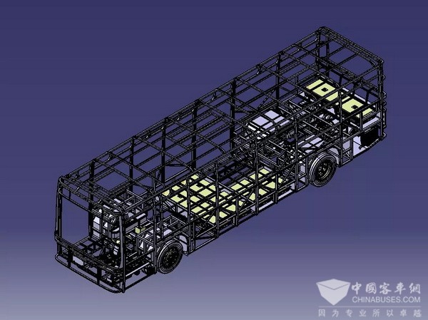 整车骨架升级。经CAE分析,优化结构,主承载结构采用高强度钢材,保证骨架强度的同时实现轻量化设计,车身减重800Kg。