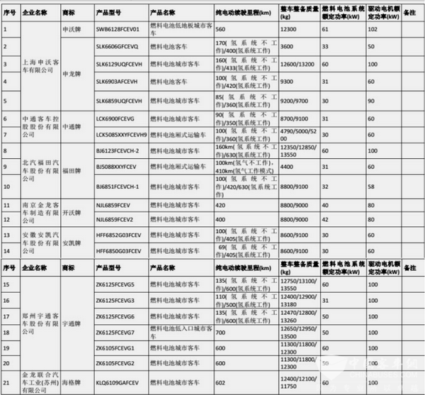 21款燃料电池客车入选工信部公示第1批免车船税新能源汽车目录