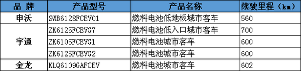 值得关注的是,在上述21款燃料客车中,有5款车型续驶里程超过500公里,分别为申沃客车SWB6128FCEV01燃料电池低地板城市客车,其续驶里程为560km; 宇通ZK6125FCEVG7燃料电池低入口城市客车,续驶里程达到了700km;以及宇通两款型号为ZK6105FCEVG1、ZK6125FCEVG2的燃料电池城市客车,其续驶里程为600km;另外还包含一款金龙客车KLQ6109GAFCEV燃料电池城市客车,续驶里程为602km。