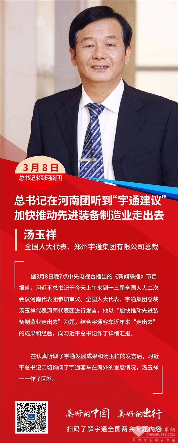 2019年3月8日上午,中共中央总书记、国家主席、中央军委主席习近平来到十三届全国人大二次会议河南代表团参加审议。全国人大代表、郑州宇通集团有限公司总裁汤玉祥作为代表,以“加快推动先进装备制造业走出去”为题,结合宇通客车近年来“走出去”的探索和实践,向习近平总书记作了汇报。