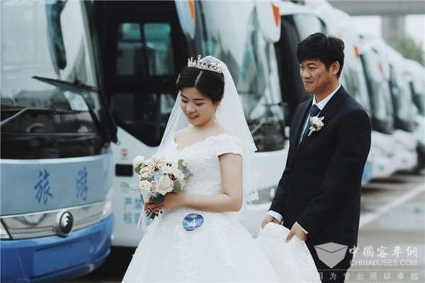 随后,新人和家属们乘坐宇通凯伦宾威房车和宇通大巴沿工业园参观线路游览。在承装二车间,他们受到了车间员工的热烈欢迎。从现代化的生产线旁经过时,一台台美观大气的宇通客车吸引了他们的目光。看着外表气派、内饰考究的客车,新人和家属们赞不绝口。