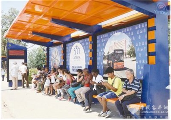 哈瓦那市民在宇通公司捐赠的公交站候车