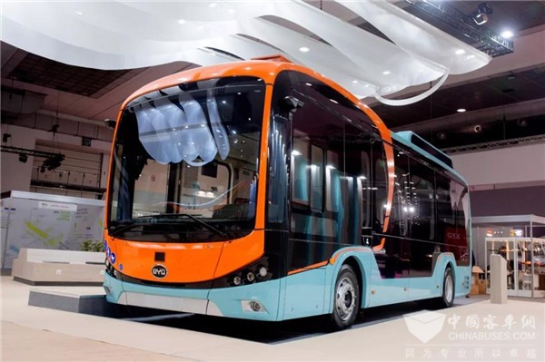 采用全新内外饰设计及配色的比亚迪纯电动巴士亮相比利时世界客车博览会
