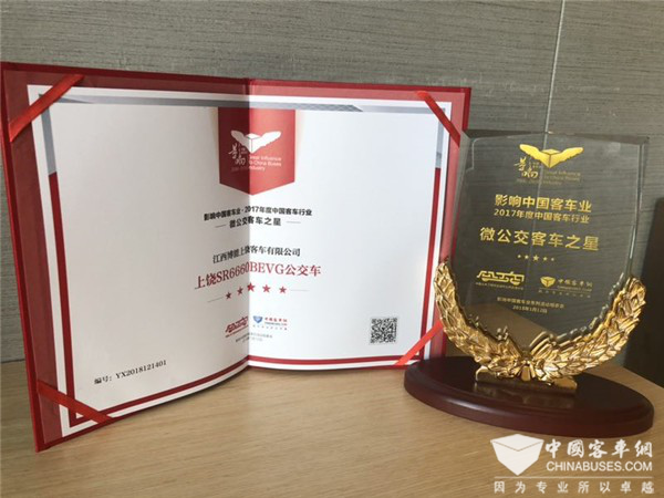 值得一提的是,在2019年1月12日,由中国土木工程学会城市公共交通分会与XINGKONG.COM联合主办的第13届影响中国客车业年度调查评选活动中,上饶客车在参评的200余款市场畅销客车产品中脱颖而出,其参评车型SR6660BEVG纯电动城市公交车获得“微公交客车之星”奖项。