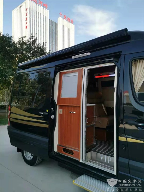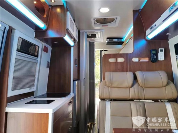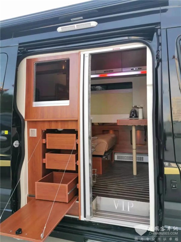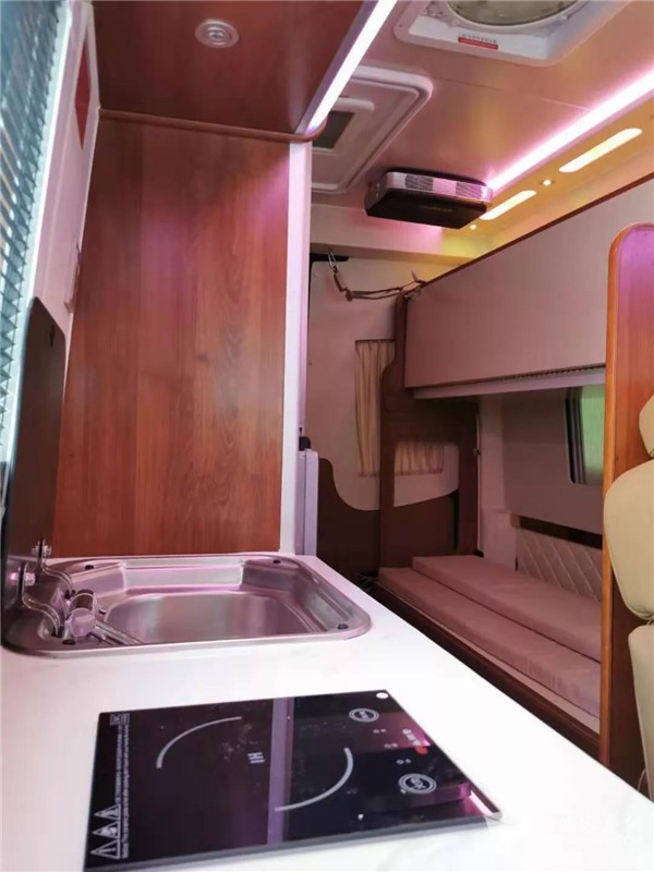一进车门的左手边是车辆的厨房区域,在厨房台上装有电磁炉和洗菜池。厨房台内部是贯通式的储物空间,在车内打开柜门使用,在车外同样拉开挡板,抽出抽屉即可使用,避免了有时做饭需要跑上跑下的窘境。