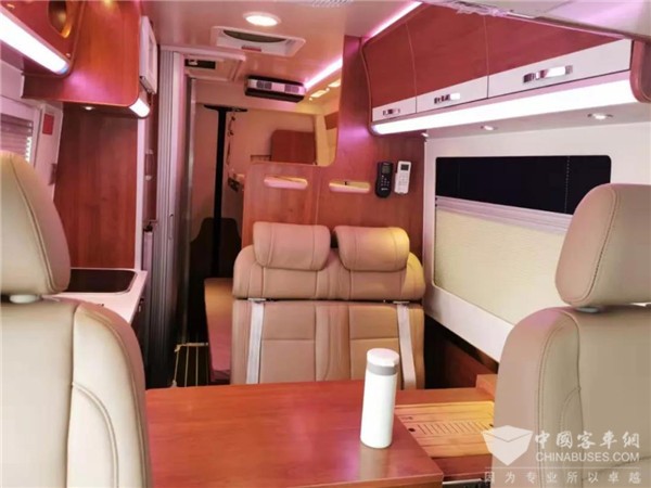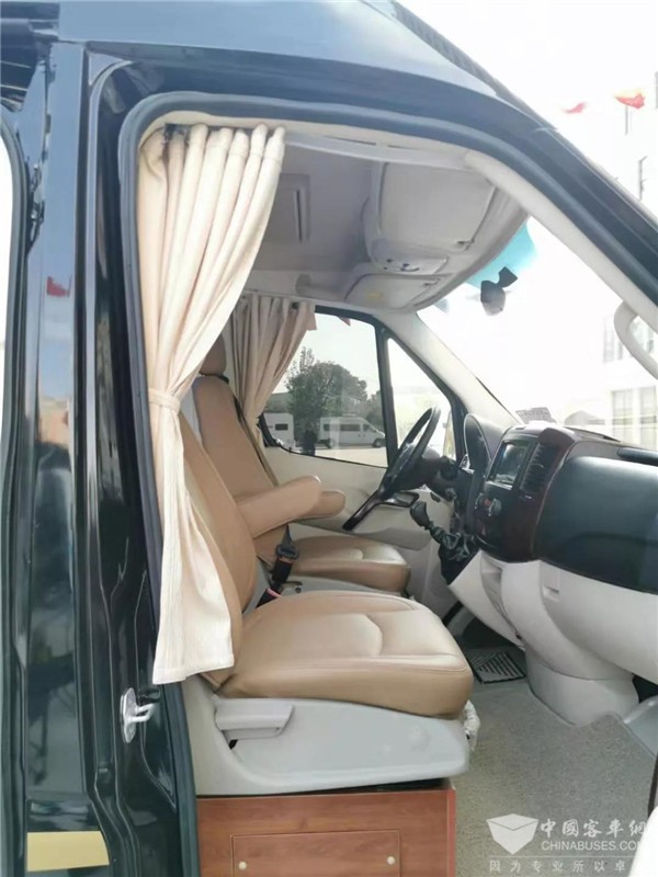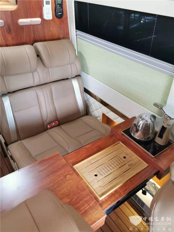 进入车内,木纹色的家具结合米色房车专用座椅,暖色灯光的照映下显示出其商务风的内饰风格。车内布局方面,亚星提供了多种选择,图中我们看到的是4座版,商务区靠窗左侧2人连坐式豪华座椅1张,座椅前是可拉伸茶水桌。除此之外,还有以下布局方式: